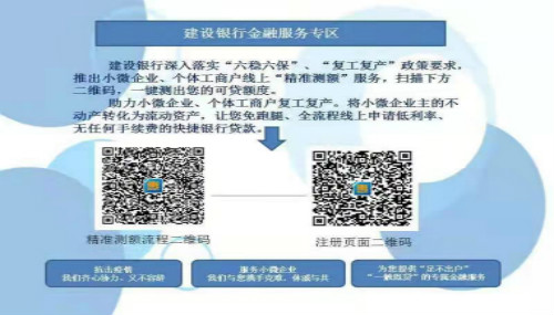 建設(shè)銀行金融服務(wù)專區(qū)2021-03-17建設(shè)銀行深入落實(shí)“六穩(wěn)六?!?、“復(fù)產(chǎn)復(fù)工”政策要求,推出小微企業(yè)、個(gè)體工商戶線上“精準(zhǔn)測(cè)額”服務(wù),掃描下方二維碼,一鍵測(cè)出您的可貸額度。珠粒小微企業(yè),個(gè)體工商戶復(fù)工復(fù)產(chǎn)。將小微企業(yè)主得不動(dòng)產(chǎn)轉(zhuǎn)化為流動(dòng)資產(chǎn),讓您免跑腿、全流程線上申請(qǐng)低利率、無(wú)任何手續(xù)費(fèi)得快捷銀行貸款。
